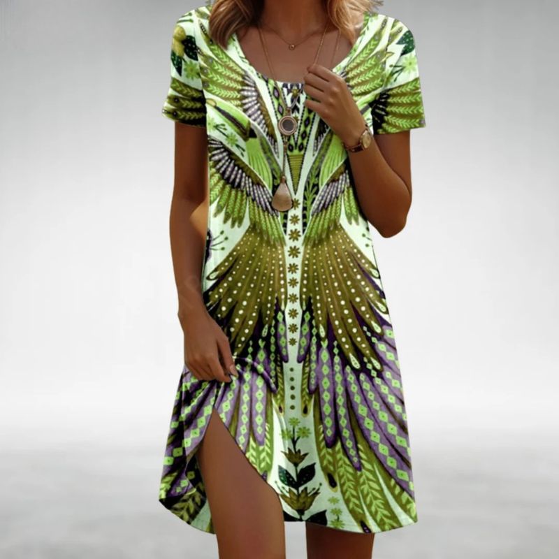 Step into easy elegance with the Evania Bohemian Print Dress—a piece that celebrates vibrant artistry and relaxed femininity. With its bold, wing-inspired pattern and breezy silhouette, Evania flatters the figure while offering absolute ease of movement. Perfect for beach strolls, brunches, or summer getaways, it blends expressive design with everyday versatility.